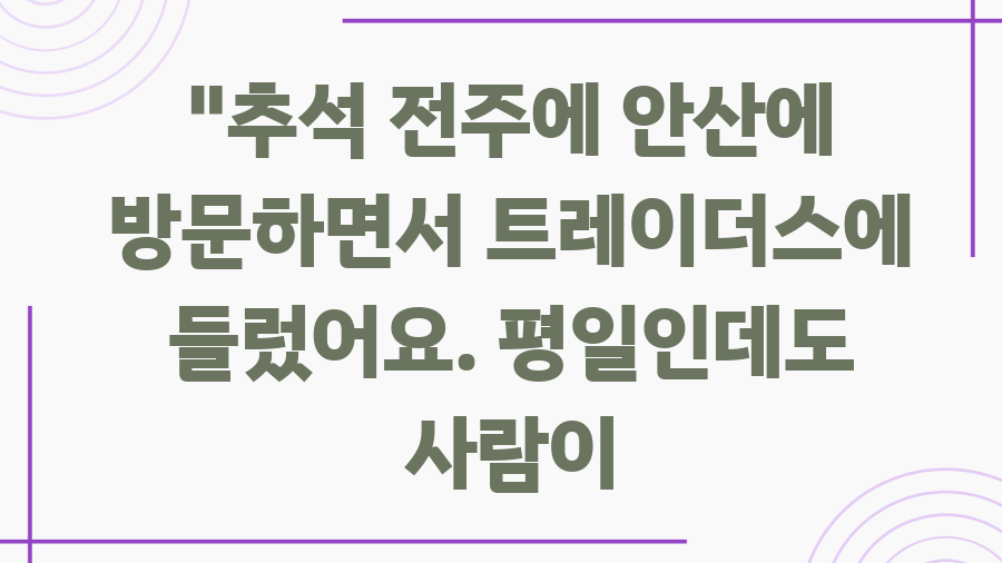 - 주차 팁: 안산 트레이더스는 안산역 근처에 위치해 있어 접근성이 좋습니다. 주차장은 2층부터 6층까지 넉넉하게 마련되어 있지만, 주말이나 공휴일에는 혼잡할 수 있으니 참고하세요.