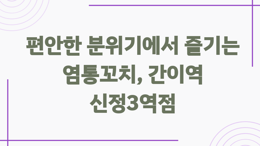 간이역 신정3역점은 체인점이지만, 울산 남구 신정동에 위치해 접근성이 좋고, 염통꼬치가 인기 메뉴입니다. 소금구이 스타일로 나오며, 깔끔한 소스와 함께 즐길 수 있습니다. 🧂