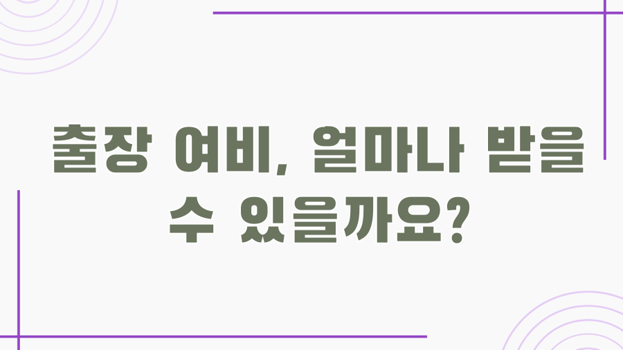 - 근무지 내 국내출장: 출장 여행시간이 4시간 이상인 경우, 2만 원이 정액으로 지급됩니다 (1만 원 또는 2만 원 정액 지급되는 경우도 있습니다).