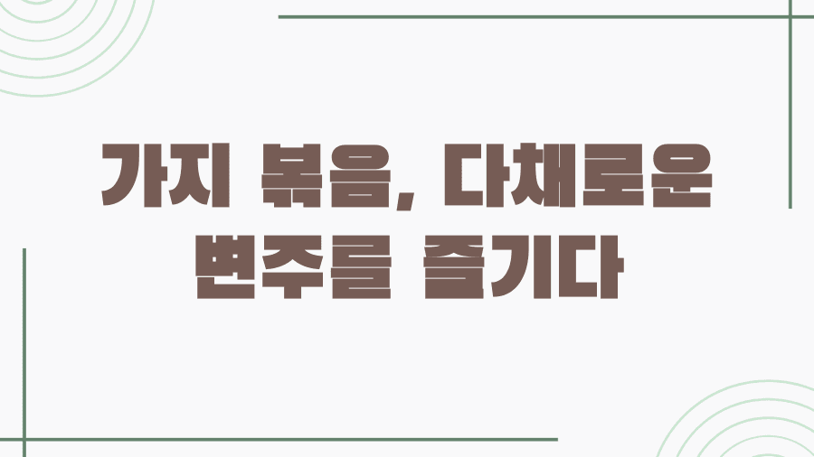 가지 볶음은 가지의 식감과 맛을 가장 잘 살려주는 조리법 중 하나로, 다양한 양념과 재료의 조합으로 무궁무진한 변주가 가능한 메뉴입니다.