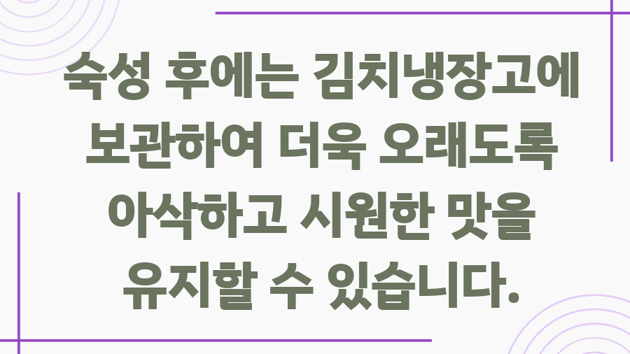 숙성 후에는 김치냉장고에 보관하여 더욱 오래도록 아삭하고 시원한 맛을 유지할 수 있습니다. 김치냉장고가 없다면 서늘하고 어두운 곳에 보관하는 것이 좋습니다.