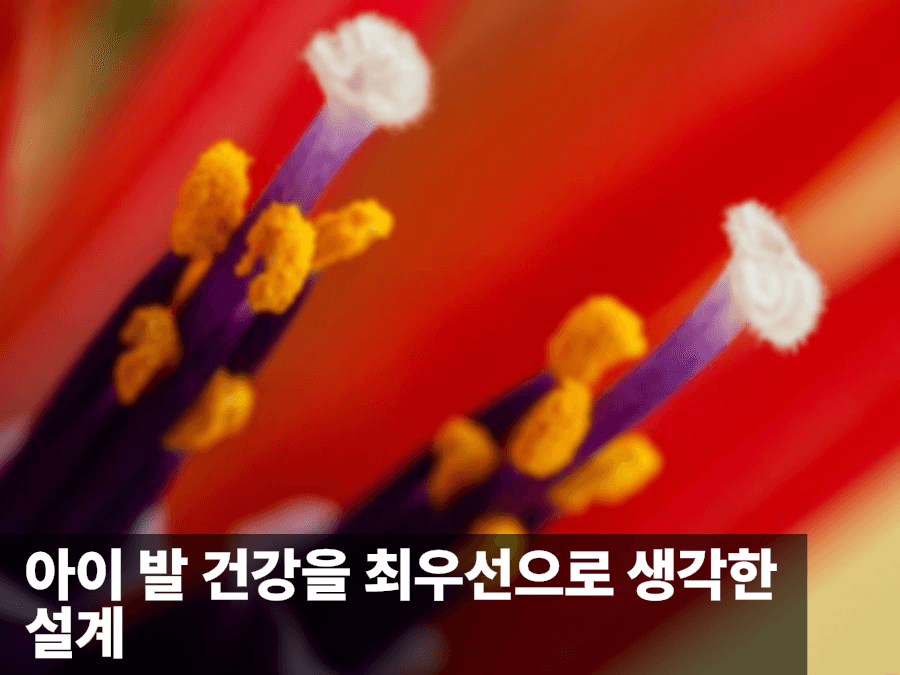 발에 꼭 맞는 편안한 착화감 역시 이 신발의 큰 매력 중 하나예요. 아이들이 하루 종일 뛰어놀아도 발이 아프거나 무리가 가지 않도록 충분한 공간 조절과 함께 통기성 좋은 소재를 사용했습니다.