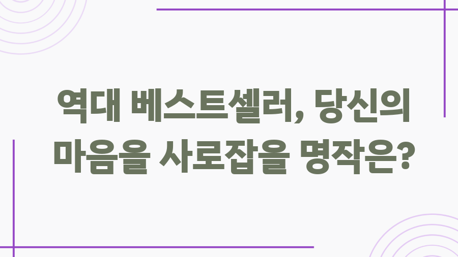수많은 책들이 쏟아지는 세상에서, 꾸준히 사랑받고 시대를 초월하는 매력을 지닌 책들이 있습니다. 바로 오랜 시간 동안 많은 사람들의 마음을 사로잡은 역대 베스트셀러들이죠. 단순히 많이 팔린 책이 아니라, 독자들에게 깊은 감동과 영감을 주고, 때로는 사회에 큰 영향을 미치기도 했습니다. 오늘은 그러한 책들의 세계를 함께 탐험하며, 베스트셀러의 매력과 그 이면에 숨겨진 이야기들을 파헤쳐 보겠습니다. 어떤 책들이 여러분의 마음을 사로잡을지 기대되지 않으세요?