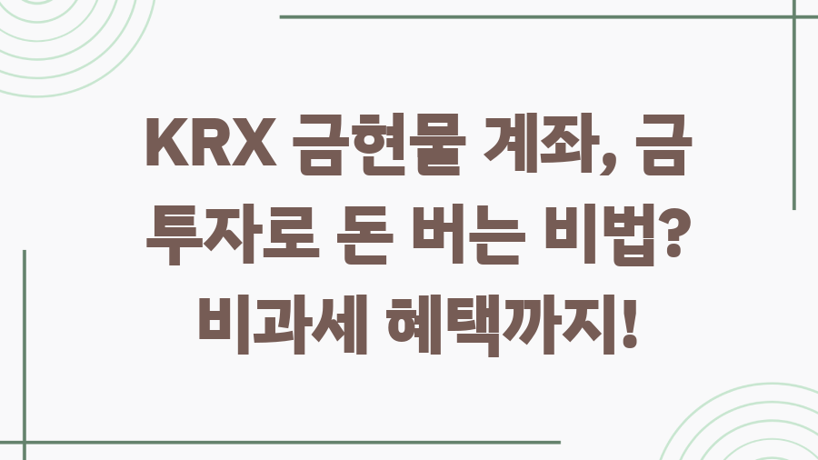 KRX 금현물 계좌, 금 투자 똑똑하게 시작하는 방법 금 투자를 생각하고 계신가요? 혹시 금은방에서 금을 사는 것만 생각하셨나요?금 투자는 생각보다 다양한 방법이 있습니다. 그중에서도 KRX 금현물 계좌는소액 투자부터 세제 혜택까지 누릴 수 있는 매력적인 선택지입니다.오늘은 KRX 금현물 계좌에 대해 자세히 알아보고, 어떻게 활용하면 좋을지 꿀팁을대방출하겠습니다! KRX 금현물 계좌란 무엇일까요?KRX 금현물 계좌는 한국거래소(KRX)에서 운영하는 금 현물 거래 전용 계좌입니다.마치 주식처럼 금을 사고팔 수 있는 것이죠. 가장 큰 장점은 1g 단위로 소액 투자가가능하다는 점입니다. 비싼 금덩어리를 직접 사지 않아도, 적은 돈으로도 금 투자에참여할 수 있다는 거죠! KRX 금현물 계좌, 왜 특별할까요?KR..