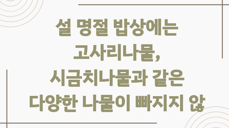 설 명절 밥상에는 고사리나물, 시금치나물과 같은 다양한 나물이 빠지지 않습니다. 삼색나물은 색깔의 조화뿐 아니라 영양 균형까지 고려한 음식입니다. 또한, 당면과 여러 가지 채소를 함께 버무려 만든 잡채는 풍성한 식감과 달콤한 양념의 조화가 일품입니다.