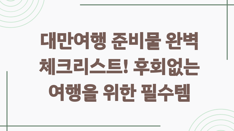 대만 여행, 설렘 가득한 준비! 놓치면 후회할 준비물 체크리스트! 대만 여행을 계획 중이시라면, 흥미진진한 야시장부터 아름다운 자연 풍경까지 기대되는 것들이 많으시죠? 하지만 설렘만큼 중요한 것이 바로 철저한 준비입니다. 대만의 변덕스러운 날씨와 현지 상황에 맞춰 꼼꼼하게 준비물을 챙기지 않으면 여행의 즐거움이 반감될 수도 있으니까요. 오늘은 제가 여러분의 대만 여행을 더욱 풍성하게 만들어줄 필수 및 선택 준비물과 유용한 팁들을 알려드리겠습니다. 잊지 말고 꼼꼼하게 체크해보세요! 필수 준비물: 여권과 안전한 여행의 시작가장 중요한 것은 당연히 여권입니다! 유효기간이 6개월 이상 남았는지 꼭 확인하고, 여권 사본도 몇 장 준비해 두세요. 분실이나 도난에 대비하는 것은 물론, 비상시 신분증명에도 유용합니다...